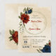 Unique wedding invitation featuring romantic burnt orange and navy blue flowers and green leaves.