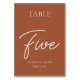 Modern table numbers elevate your wedding reception table décor. The design features an elegant script font in white on a burnt orange earth tone background perfect for a fall wedding or banquet event. Order each table number from the collection or edit this card for each number needed. The design is printed on both sides.
