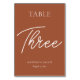 Modern table numbers elevate your wedding reception table décor. The design features an elegant script font in white on a burnt orange earth tone background perfect for a fall wedding or banquet event. Order each table number from the collection or edit this card for each number needed. The design is printed on both sides.