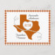 A casual and fun way to share your joy well in advance of your big day. Send these Texas save the date cards out to all your family and friends. Design features a large state shape with a heart made from a white ribbon with black dashes. Space inside the heart for your date and at the bottom for your location. Bordered with a coordinating gingham pattern. Perfect mix of classy and rustic in case you haven't decided what style you're going with! Available Texas school colours of red, green, dark green purple, maroon, and burnt orange as well as blue and black. Matching products available.