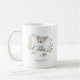 Adorable personalized coffee mug features a cheeky watercolor koala inside a wreath of green eucalyptus leaves and wattle flowers. Personalize with a name or monogram beneath in gray script lettering.