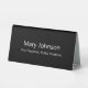 A display image is at the top. You can replace the image with your company logo. This black tabletop sign has white display text that you can edit. There are two lines of text on each side. The top line is for the employee's name. The bottom line is for their professional title or a custom message such as an organisation name.