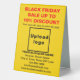 Customisable table sign with Black Friday Sale, your business name and other information. Table sign that you can use as marketing material to attract more customers. Customise it and display it to convince more customers to buy your products or clients to like your services. Design colours are black and red texts on yellow background. Contents are Black Friday Sale, percent discount that you will offer, sale dates, your business name, logo, address, phone number, e-mail and website or your business social media page. Please check the appearance after uploading logo and typing texts. If the appearance is pleasing to you, you can place your order now. If you need to resize and move the logo and texts to fit on this table sign, please change in the design tool. You can also change the background colour, font colour and font style in the design tool. Wishing you more sales this Black Friday.