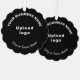 Scalloped paper ornament card with your business name, logo, city or town and state. You can use it as accessory of packaging material of your product. Ornament card as tag of your product. Ornament card that you can use as marketing material to promote your brand name or to advertise your business to customers. Ornament card with your business brand to build brand name awareness. Design colours are white texts on black background. Please check the appearance on front and back sides after uploading logo and typing texts. If the appearance is pleasing to you, you can place your order now. If you need to resize and move the logo and texts to fit on this ornament card or on the style that you will choose, please change in the design tool. You can also change the background colour, font colour and font style in the design tool.