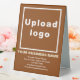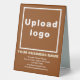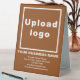 Table sign that you can customise to put your business name and other information of your business. You can display it on your desk as marketing material to advertise your business or to promote your brand name to customers or clients. Customisable signage that you can use to build brand name awareness. Design colours are light brown and white texts on brown background. To customise this table sign, upload your business logo, type your business name, address, phone number, e-mail and website or your social media page. Please check the appearance after uploading logo and typing texts. If the appearance is pleasing to you, you can place your order now. If you need to resize and move the logo and texts to fit on this table sign, please change in the design tool. You can also make other changes according to the appearance of this table sign that you prefer in the design tool such as changing the background colour, font colour and font style.