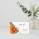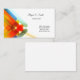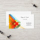 This business card is shown in a multi colour abstract pattern with black text.