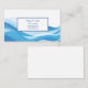 This business card is shown in a blue tones abstract wave pattern with blue text.