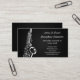 Business cards for saxophone players or instructors; black and white music design with a silver illustration of a saxophone; the design can be personalised, there are customisable text fields for adding your name, business, address, and other information