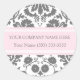 Customisable company name and contact information business stickers in light baby pink, dark charcoal grey and white classic floral damask vintage pattern, perfect for adding your information to bags, parcels or envelopes. Contact us for a custom colour or for matching small business products.