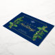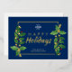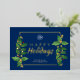Classy modern horizontal happy holidays busines corporate both side print flat greeting card with a place for your logo featuring elegant classic watercolor christmas leaves and real gold foil pressed frame and happy holidays text on a navy blue background. Perfect Christmas Greeting Card for business companies, small business, home business, employees, holiday company or any organisation, the modern design will give your clients the impression of luxury and success. The back side has custom wording. This Happy Holidays card template is ready for your online personalisation. The gold foil can be changed to rose gold or silver.