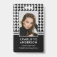 Make a stylish impression with this chic and elegant ID badge. A modern template featuring the iconic houndstooth pattern, paired with contrasting stripes. Personalise with your name, job title, company name or location, QR code and contact information. All of the text can be customised or deleted to suit your business needs. This classic design is ideal for many different workplaces and professions, including fashion stylists, beauty consultants, creative directors, interior designers, corporate professionals, retail staff, hotel staff, small businesses, conference name tags and more! Printed colours: black and white.