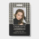 Create a stylish first impression with this chic and elegant ID badge. A modern template featuring the iconic houndstooth pattern, paired with contrasting stripes. Personalise with your name, job title, company name or location, QR code and contact information. All of the text can be customised or deleted to suit your business needs. This classic design is ideal for many different workplaces and professions, including fashion stylists, beauty consultants, creative directors, interior designers, corporate professionals, retail staff, hotel staff, small businesses, conference name tags and more! Colours: black and off-white.