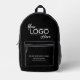 Modern professional black backpack for your business featuring your logo. Add your business name, slogan, website, socials or other text in simple white typography on the front pocket.