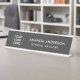 Define your office space with our custom clean grey professional company desk name plate, featuring your business logo. Crafted for durability and style, this sleek desk accessory not only adds a personalised touch to your workspace but also reinforces your brand identity. Ideal for executive offices, reception desks, or conference rooms, it showcases your company's professionalism and attention to detail. Whether used for personal branding or team identification, this customisable desk name plate ensures a sophisticated presentation that leaves a lasting impression on clients, visitors, and employees alike."