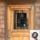 Modern black window cling sign for your business. Upload your logo and QR code for customers to scan for a list of your products, services, prices or other information. Add your business name, open hours or other text in simple white typography.