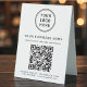 Modern table top tent sign for your business with your QR code for customers to scan for a list of your products, services and prices. Add your logo, company name, QR code, phone number and street address in simple typography.