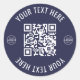 This modern round QR code sticker features a navy blue background with white sans serif fonts and a white QR code for a clean, bold look. Designed for versatility, it’s perfect for restaurants, bars, cafes, salons, retail shops—any business that wants to offer quick, contactless access to information.