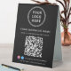 Modern black table top tent sign for your business. Upload your logo and a QR code for customers to scan for a list of your products, services, prices or other information. Add your company name, phone number, website address, etc., in simple white typography.