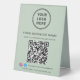 Modern sage green table top sign featuring your logo and QR code for customers to scan for a list of your products, services, prices or other information. Add your company name, phone number, website address, etc., in simple typography.