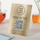 Modern brushed gold faux metallic table top pedestal sign for your business with a QR code for customers to scan for payments, enabling you to receive payments anytime, anywhere. Upload your logo and add your business name, phone number and street address or other information in simple typography. Input your payment website address to automatically create a scannable QR code.