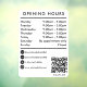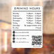 A white opening business hours window decal and window cling featuring QR Code, your custom social media icons and contact details. A personalised shop hours window cling perfect for shop windows and front door signs. Perfect for a business shop owner who would like to notify their customers about its opening hours.
