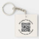 Black and white key ring with QR code and two lines of curved text. Advertise a business with name that curves around the top and address at the bottom on off-white background. This key ring has the design on one side only.
