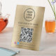 Modern brushed gold faux metallic table top pedestal sign for your business with your QR code for customers to scan for a list of your products, services and prices. Add your logo, business name, QR code, phone number and street address in simple typography. Add your instagram and facebook user ids for customers to follow you on social media.