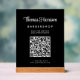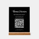 Modern black acrylic tabletop sign featuring your name in a stylish white signature script and business type in simple white lettering. Input your website address to create a scannable QR code for customers and clients to view your products, services, hours, etc.