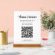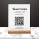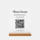 Modern white acrylic tabletop sign featuring your name in a stylish signature script and business type in simple lettering. Input your website address to create a scannable QR code for customers and clients to view your products, services, hours, etc.