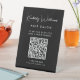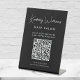 Chic black pedestal tabletop sign for your business featuring your name showcased in a stylish white signature script and business type below in clean white lettering. Input your website address to create a QR code that customers and clients can scan for appointments, products, services, hours, etc.