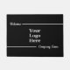 In the center, there's a display image you can replace with your company's logo. Above the logo, there's display text in a white script you can replace with a custom message if desired (Shown: Welcome). At the bottom, there's display text you can edit to add your company name. The welcome is black. All text may be edited or deleted.