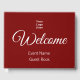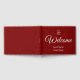 On the front of this deep red guest book, there are three lines of white display text you can edit to create a custom message (Shown: Welcome Event Name Guest Book). The second line of display text will also appear on the spine.