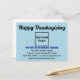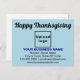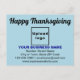Happy Thanksgiving! Holiday to celebrate this November to thank for the blessings that we received. It is also one of the holidays to advertise your business. Postcard card that you can customise to put your business brand and with Thanksgiving greeting. Customise it and use it to greet your customers or clients this Thanksgiving and as marketing material to advertise your business or to promote your brand name. Customisable postcard that you can use to build brand name awareness. Design colours are black and dark blue texts on light blue background. To customise this postcard, upload your business logo, type your business name, address, phone number, e-mail and website or your business social media page. Please check the appearance after uploading logo and typing texts. If the appearance is pleasing to you, you can place your order now. If you need to resize and move the logo and texts to fit on this postcard, please change in the design tool. You can also change the background colour, font colour and font style in the design tool. You can also add images and texts on the back side of this postcard in the design tool. Happy Thanksgiving! Wishing you more sales this holiday.