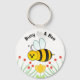 A yellow and black bee with the words Busy As A Bee in curved text above. Below are yellow, red and green flowers.