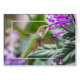 A post card featuring a close up image of a hummingbird feeding at a lovely purple flower.