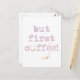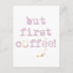 NewParkLane - Postcard, with fun quote 'But first coffee!' in an old fashioned typewriter font in lavender / purple, with the letter 'o' being a coffee stain.