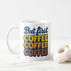 The warm color palette of yellow, orange, and brown stacked on a dark blue background evokes a nostalgic 70s diner or retro coffee shop vibe. This mug is a perfect gift for anyone who loves vintage style, bold colors, or simply prioritizes caffeine above all else.