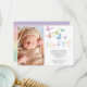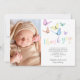 Colorful modern baby shower thank you cards featuring a plain white background that can be changed to any color, trendy pastel rainbow colored butterflies, a photo of the newborn baby, and a cute thank you message.