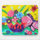 A vibrant painting of butterflies and ladybugs around a vase of brightly coloured flowers. Perfect for cheerful wishes for friends and family.