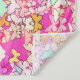 Tapestry in a flock of butterflies in soft shades of pink, peach, aqua and orange against a deep fuchsia pink background