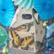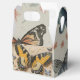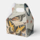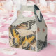A delicate favour box adorned with lifelike butterflies in a range of vibrant colours, fluttering across a light-coloured background. The butterflies' wings showcase intricate patterns and delicate veins, symbolising transformation and beauty. The box is crafted from pale ban block paper, adding a touch of rustic charm.