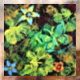 Flowers, a butterfly and leaves are glowing in this colorful painting that has been digitally altered.