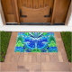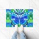 Doormat in a large blue and turquoise butterfly on an ornate, arabesque medallion background, in cobalt blue, turquoise and jade green
