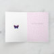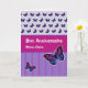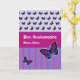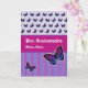 A modern birthday card design in French ready for you to personalise with your own text and the name of the recipient. The colour scheme is pink, lilac and blue, and there are coordinating butterflies and stripes patterns on the front. Inside, there is a single butterfly on one side, and a delicate pattern of scattered hearts on a pale pink background on the other. Type in the boxes to change the greeting on the front "Bon anniversaire" (="Happy Birthday") and the name. And change the message inside, or use "Je vous souhaite une merveilleuse journée. " (="Wishing you a wonderful day".)
