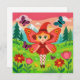 A vibrant and playful 2D cartoon illustration featuring a young fairy with large, red-patterned butterfly wings. The character wears a tall red pointed hat, a matching red dress, and polka-dot tights, floating in a lush green meadow. The scene is filled with oversized colorful flowers and fluttering butterflies, set against a background of evergreen trees and snow-capped mountains under a warm sunset sky.