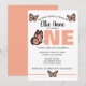The large statement “ONE” in warm peach tones creates a bold focal point, while delicate butterfly illustrations add a whimsical, feminine touch. Clean, modern fonts paired with soft, fluttery details make this invitation both elegant and fun.