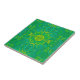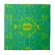 Ceramic tile featuring whimsical arabesque pattern full of summer vibes. Stylised flowers, butterflies, tree branches and solar spheres. Vintage / ethnic / bohemian / boho / hippie / 70s / newage style. Yellow and green colours, hand drawn pastel texture.