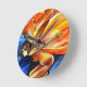 with original fantasy art design from watercolour artist Sacha Grossel of orange winged, surrealist style butterfly girl with deep blue background. Colourful and bright with light filled wings, this surrealist fantasy design is something of unique beauty.