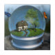 Inside a "snow globe" is a summer landscape with a cottage overshadowed by maple and cherry trees. The surrounding grassy field is filled with lilies and wildflowers in bright colours. Roses and ivy climb the wall of the little house. It's a late summer day, and a thousand bright orange and blue butterflies swirl around the globe.