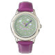 Delightful happy time watch for girls featuring purple and green zigzag pattern background for whimsical smiling butterfly and purple flowers with light blue clouds drifting by. We specialise in custom-made designs, contact us if you would like a unique made-to-order layout using this zigzag and butterfly image.